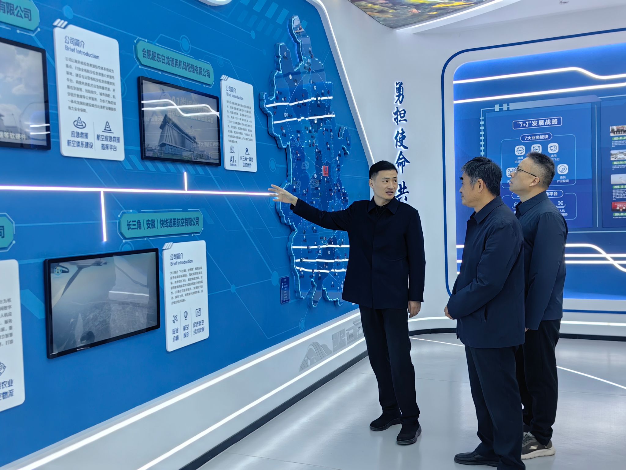 调研期间,许卫一行在安徽省通航无人机科技公司执行董事、总经理吴保宁等的陪同下,先后参观了安徽通航集团一楼展厅和通航无人机科技公司,详细了解了安徽通航集团的成立背景,在通用机场建设与运营、通航飞行服务、低空旅游、应急救援等业务板块的发展现状、战略规划以及显著成就。