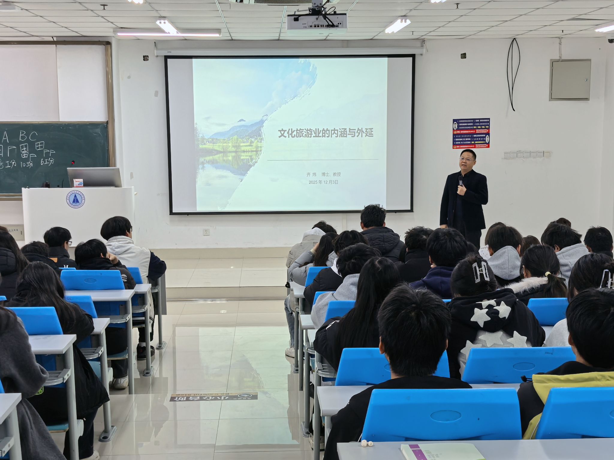 近日,文化旅游与教育学院齐炜教授在主教204举办了一场《文化旅游业的内涵与外延》的专题讲座。现场气氛热烈,座无虚席。