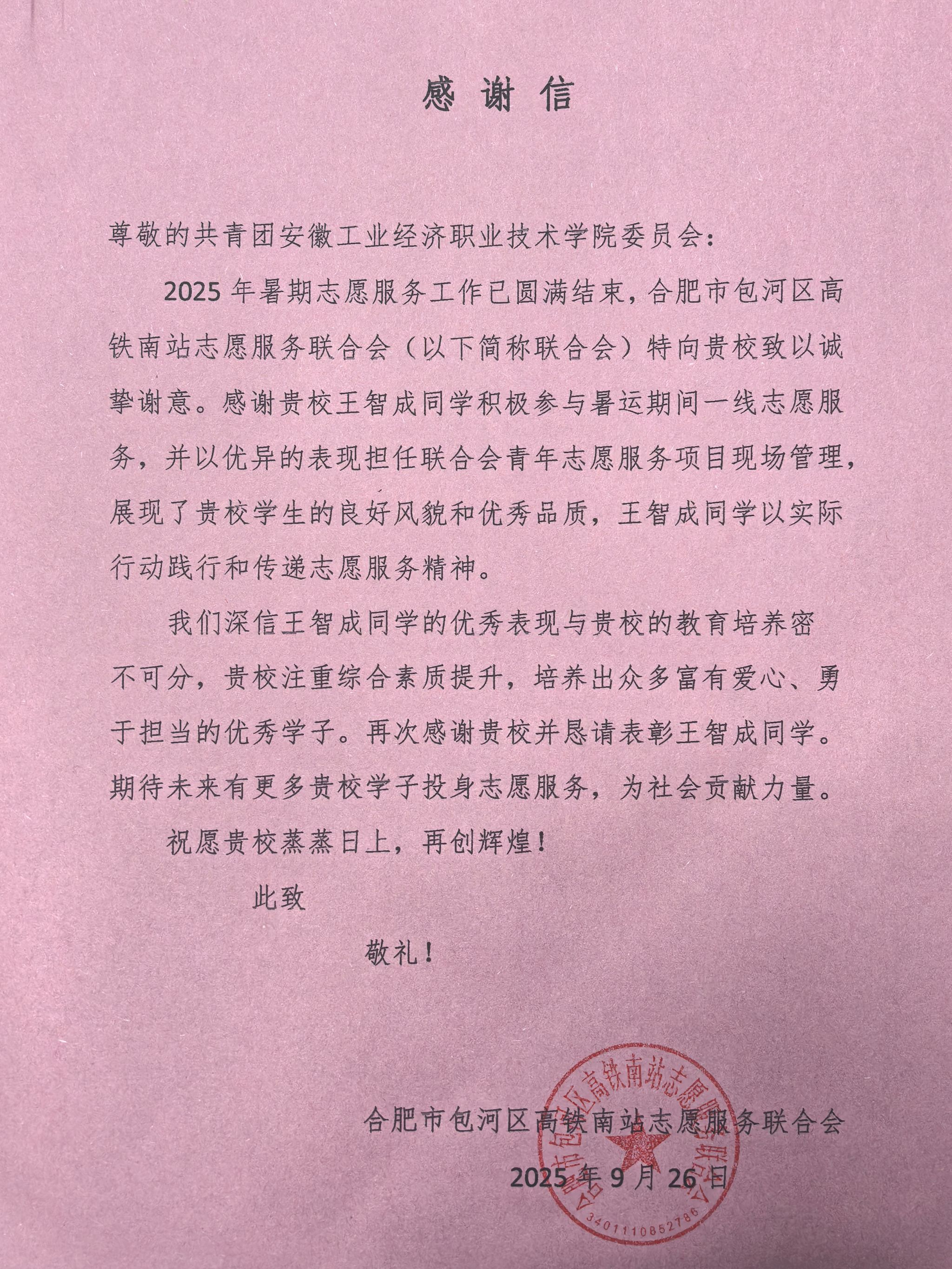 近日,一封来自合肥南站的感谢信送至我院,这封信对计算机与人工智能学院2024级王智成同学在暑期志愿服务中的突出表现予以赞扬和感谢。